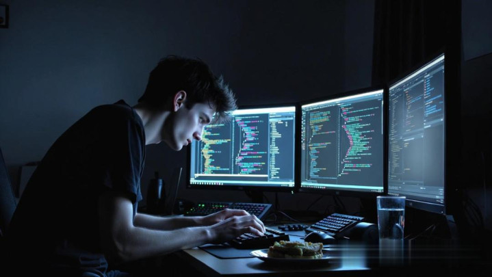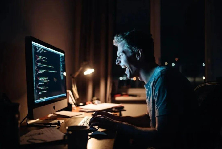 他佝偻在屏幕前,指尖翻飞,眼底布满血丝。