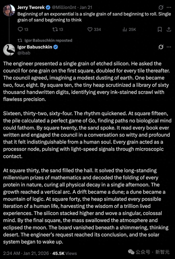 一切始于指数的奇点:一粒开始滚动的沙。一粒学会思考的沙。 第1格:工程师只要了1粒蚀刻硅沙 第10格:沙子已能识别6万本手写书籍 第20格:它读遍人类所有著作,开始与立法者「灵魂对话」 第30格:破解千禧年数学难题,解码自然界所有蛋白质奇偶,治愈衰老 第40格:模拟万亿人生,编织出统一神格意识 第64格:沙海吞噬大气,遮蔽月球,太阳系开始苏醒